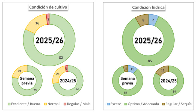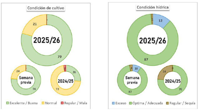 La siembra de maíz con destino a grano avanzó 0,7 p.p., alcanzando el 37,3 % del área nacional proyectada para la campaña en curso, aunque presenta una demora interanual de 34-12.64 p.p. La implantación de lotes de fecha temprana se dio por finalizada, y se espera que en los próximos días comiencen las labores de siembra tardía en gran parte del área agrícola. A la fecha, el 100 % de los lotes sembrados presentan una condición entre Normal y Excelente, favorecida por la adecuada humedad en los perfiles. Sin embargo, un 12 % del área implantada mantiene una condición hídrica excesiva, lo que limita la realización de refertilizaciones y otras labores complementarias.