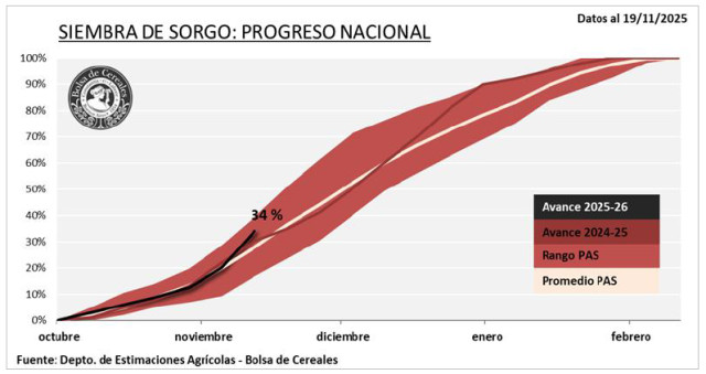La siembra de sorgo granífero avanza en el centro del área agrícola, alcanzando el 34 % del total nacional con buenas condiciones hídricas.