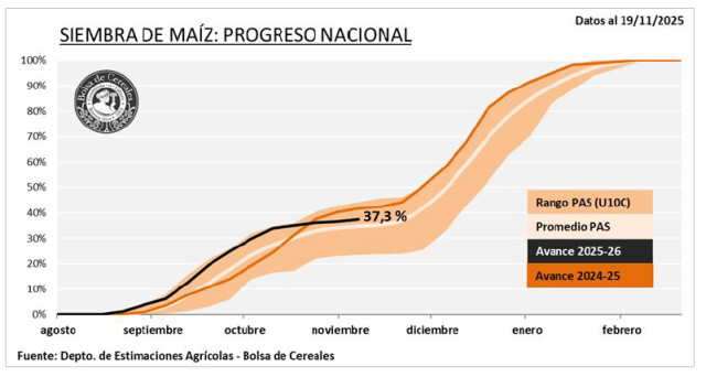 La siembra de maíz alcanzó el 37,3 % del área proyectada, con lotes en condición mayormente Normal a Excelente gracias a la buena humedad, aunque persisten excesos hídricos en el 12 % que dificultan labores.