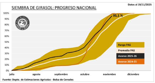 La siembra entra en su etapa final, con un progreso intersemanal de 10,5 p.p. alcanzando el 95,1 % de las 2,7 MHa proyectadas. El 98 % mantiene condición Normal a Excelente y el 85,1 % presenta humedad Adecuada/Óptima.