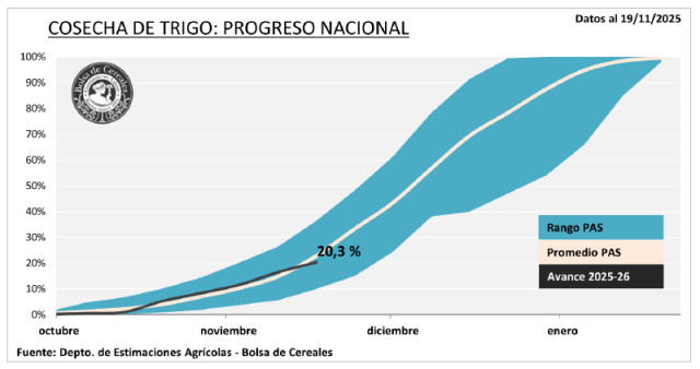 Tras las lluvias, se registró un progreso intersemanal de cosecha de 3,8 p.p., cubriendo el 20,3 % del área apta. El rinde promedio alcanza los 29,9 qq/Ha, manteniendo la proyección de producción en 24 MTn.