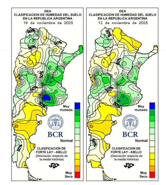 La siembra de soja de primera en la región núcleo avanza al 70%, pero se mantiene muy por detrás de los ritmos históricos: 25 p.p. menos que el año pasado y 18 por debajo del promedio de las últimas cinco campañas. Aún falta implantar cerca de 1 M ha y las lluvias del fin de semana volvieron a frenar las labores justo cuando la ventana óptima de siembra empieza a estrecharse, ya que se extiende hasta el 20 de noviembre. En Aldao, en el centro-sur santafesino, advierten: “vos sembras y el cultivo necesita al menos una semana para emerger. Pero en el medio te caen 40 mm. Cada 3 o 4 días estamos teniendo que interrumpir las labores por las lluvias. Y te agarra sí o sí con algún lote sembrado de soja sin emerger que no sabes si lo tenés que volver a sembrar”. En San Pedro, noreste de Buenos Aires, el avance no supera el 15% y hacia el sur de Junín advierten que están muy demorados. El nuevo frente previsto para este jueves amenaza con dejar unas 600.000 ha al borde de salir de la ventana donde se obtienen los máximos rendimientos. En contraste, en el noroeste bonaerense —como en General Pinto— destacan que el suelo se orea rápidamente gracias al viento y las altas temperaturas, permitiendo retomar pronto la siembra. En el sur y centro-sur de Santa Fe, como Carlos Pellegrini y Bigand, tienen entre un 80 a 90% del área ya implantada y la mayoría de los productores están en condiciones de finalizar dentro del período óptimo. En Marcos Juárez, restan pocos lotes y se espera completarlos durante esta semana.