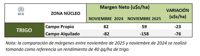 Con un precio a cosecha (diciembre) de 18,3 u$s/qq, para campo alquilado el punto de equilibrio llega recién con rindes altos: con 40 qq/ha la pérdida es de 158 u$s/ha; con 50 qq/ha aún sigue en negativo (–29 u$s/ha); y recién con 60 qq/ha se pasa a terreno positivo (75 u$s/ha). El costo del alquiler —equivalente a 18 qq/ha de soja en este análisis y prorrateado por el tiempo de ocupación del cultivo— resulta determinante y deja al trigo expuesto a un riesgo económico considerable cuando los rindes están por debajo de niveles promedios para la zona (38 qq/ha). En el caso de campo propio, pasar de 40 a 60 qq/ha lleva el margen neto de 59 a 252 u$s/ha, más de cuatro veces.