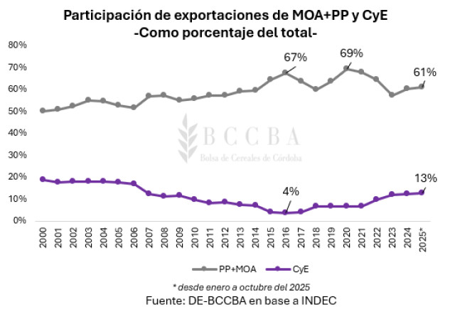 En la serie histórica de las exportaciones, la mayor participación de la categoría MOA+PP ha coincidido con períodos de menores ventas por parte del sector energético, lo que implicaría un mayor peso relativo por parte del agro dentro del total. En esta línea, el sector agroindustrial (MOA+PP) representa en promedio el 60% de los ingresos al país por ventas al exterior, no obstante, en los años 2016 y 2020 llegó a explicar el 67% y 69%, respectivamente de dichos ingresos. En los años mencionados, las exportaciones del sector energético (CyE), se ubicaron en torno al 4%, 7 puntos porcentuales por debajo del promedio (11%). Mientras que, en lo que va del 2025, registraría el 13% de las ventas totales, con proyecciones de superar dicho porcentaje.