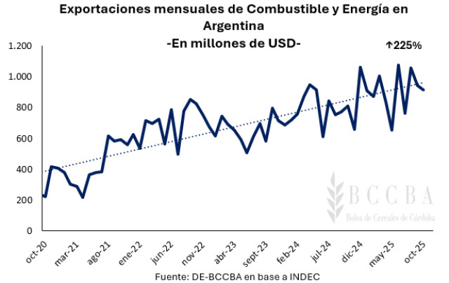 Considerando las ventas del rubro de Combustibles y Energía (CyE) de Argentina, ha experimentado un crecimiento del 225% en el periodo enero a octubre de los últimos cinco años, pasando de generar un ingreso de divisas de USD 2.800 millones para el año 2020 a USD 9.000 millones en el 2025. Este comportamiento se debe al auge de Vaca Muerta, que lo posiciona como el principal motor en la producción de hidrocarburos no convencionales según los datos brindados por la Cámara de Exploración y Producción de Hidrocarburos.