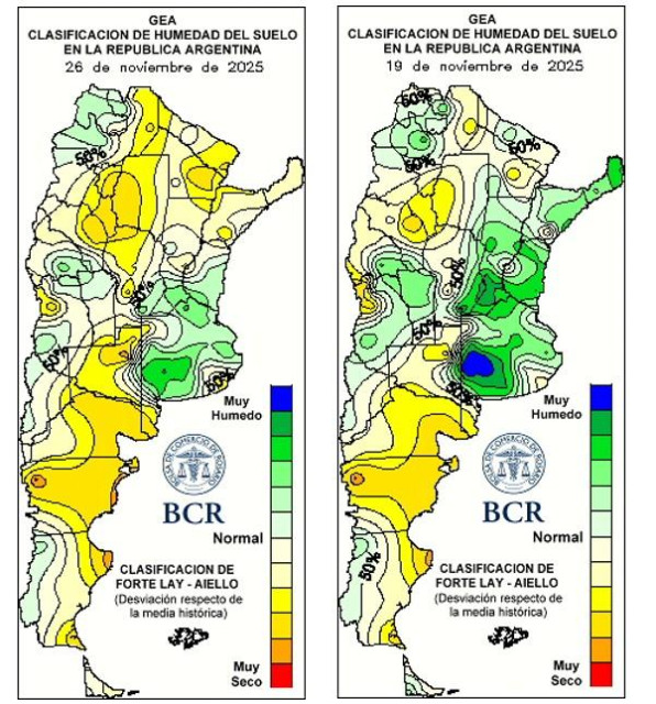 Algunos ingenieros responden que sí, ya estaría asegurado un rinde mínimo de 80 a 90 qq/ha; otros, dicen que hay que esperar más. Pero todos coinciden en dos cosas: el desarrollo que ha logrado es el cultivo es sorprendente con un estado excelente a muy bueno. Lo segundo es que las lluvias de este fin de semana van a ser muy importantes ya que el cultivo está próximo a empezar la floración en la región núcleo. ¿Porqué? Porque con buenos acumulados estaría inicando esta étapa con los perfiles practicamente cargados a tope. La campaña comenzó con reservas hídricas optimas a la siembra y, sumadas a lluvias recurrentes casi semanales, los lotes estan llegando hoy —a días de iniciar el panojamiento y entrando de a poco en el período crítico—con condiciones hídricas excepcionales. En estas condiciones, los técnicos de María Susana destacan que, el manejo marcará la diferencia: “se va a poner en evidencia qué lotes se hicieron bien y cuáles no, sobre todo en la fertilziación que se les hizo”. En Marcos Juárez, con perfiles llenos y maíces destacados por su desarrollo, los ingenieros comentan que ya “se podría asegurar un piso de 100 quintales”. En Cañada de Gómez el entusiasmo es elocuente: “es una locura los maizales que hay”, y describen plantas vigorosas con tallos robustos que hasta motivaron refertilizaciones. En Fuentes, la postal es la misma: “es una cosa de locos lo lindo que están”. En Aldao, alertan: “pintan para un año excelente, pero si bien ya hay 90 quintales asugurados, ojo que pasar de los 90 a los 120 es un camino muy largo”. El maíz temprano llega a finales de noviembre con el 90% de los lotes con condiciones muy buenas a excelentes.