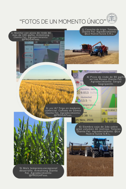 En la imagen del medio, un lote de trigo a punto de cosecharse en Cañada de Gómez mostró tal nivel de desarrollo que parece una foto generada con inteligencia artificial, pero el lote es real y la expectativa es que supere los 70 qq/ha. En Totoras, la foto de la cosecha del trigo y, luego, la de la siembra de soja de segunda. Otra cosa que no se suele ver y es otra postal destacable de este inédito ciclo triguero es el gran volumen de rastrojo tras la cosecha. Este rastrojo que va a proteger al suelo, conservando la humedad, evitando la erosión y nutriéndolo con el aporte de materia orgánica, tiene un inconveniente: ¿cómo se hace para sembrar encima la soja de 2da? En la zona los ingenieros explican: “tenés que empezar a sembrar a media mañana. De lo contrario, se entierra el rastrojo, ya que no lo corta bien la máquina por la humedad”. En las últimas fotos aparecen los maíces tempranos de Armstrong. Cabe destacar algo que hace muchos años no se veía en noviembre en la región central: un maíz tan bien desarrollado y con una estructura de planta que soprende a muchos técnicos. Desde Aldao dicen: “Está floreciendo con barro en los surcos, creció sin sufrir nungún momento de escasez”.