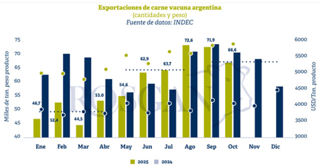 Según los datos del INDEC, en lo que va del año y hasta octubre las exportaciones de carne vacuna—sin descontar la exportación de huesos— se ubicaron en torno a 588.800 toneladas, por un valor aproximado de USD 3.155,1 millones.