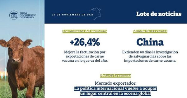 Por otra parte, China —sin dudas una de las piezas clave del mercado internacional—, que esta semana debía dar a conocer la resolución de su investigación por salvaguarda de importaciones iniciada en diciembre del año pasado, volvió a prorrogar la fecha de su dictamen final, esta vez fijándola para el 26 de enero. Si bien esta decisión afecta a todos los orígenes, en el caso particular de Argentina — que concentra el 70% de sus exportaciones de carne bovina en este único destino— el anuncio se recibe con cierto tono de alivio. Permite finalizar el año sin disrupciones en un período en el que China suele mostrar mayor actividad de compras, al tiempo que abre una posible instancia de negociación durante los próximos 60 días.