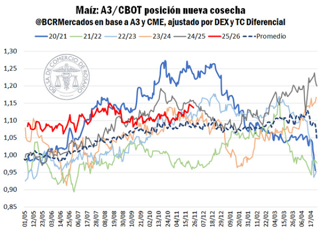 Esta coyuntura impulsó tímidamente el contrato de referencia para las fijaciones de precios FOB de maíz argentino, siendo que el embarque a partir de abril del 2026 sobre los puertos del UP-River se negocian en torno a los US$ 200/t. En base a esto, hoy el contrato de futuros local en A3 cotiza entre US$ 184 a US$ 181/t, 3% más que el año pasado a esta altura (ajustando las cotizaciones del año pasado por el efecto del tipo de cambio exportador sobre el visor de precios futuros).