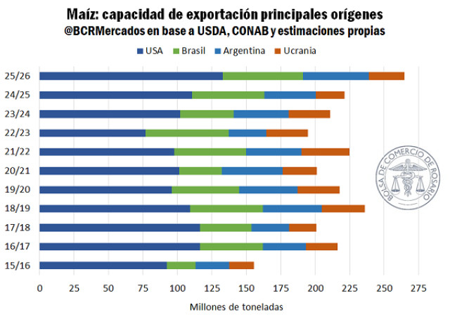 En base a las últimas estimaciones del Departamento de Agricultura de los Estados Unidos (USDA), en Norteamérica se habrían levantado 425 Mt, récord absoluto, que, junto con los stocks iniciales para la campaña marcarían un nivel de oferta 10% por encima del ciclo pasado. En Ucrania la producción se recuperó en un 20% respecto a la campaña anterior y vuelve a pisar fuerte en el mercado exportador. En Brasil ya se está sembrando el maíz de primera; las proyecciones preliminares de CONAB esperan una cosecha nacional de 138 Mt, la segunda mejor marca de su historia, apenas un 2% por debajo de la producción de este año.