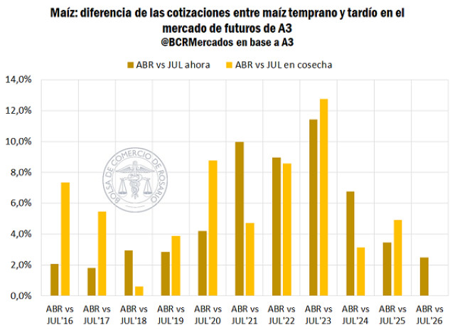 Mientras tanto, la relevancia de los planteos tempranos es marcada inclusive en las cotizaciones futuras. Entre las cosechas 2020/21 a 2023/24, la diferencia entre el precio negociado a esta altura para el contrato de abril respecto a julio (maíz temprano vs maíz tardío) fue de un 10% en promedio, factor que se explica directamente por el lado de la oferta, ya que se junta las toneladas que se cosechan en Argentina con las del maíz safrinha en Brasil. Ahora mismo, la diferencia entre las cotizaciones de los planteos tempranos contra tardíos es significativamente menor, de tan solo un 2,3% y explicado por las altas expectativas de oferta a partir de marzo en el mercado local.