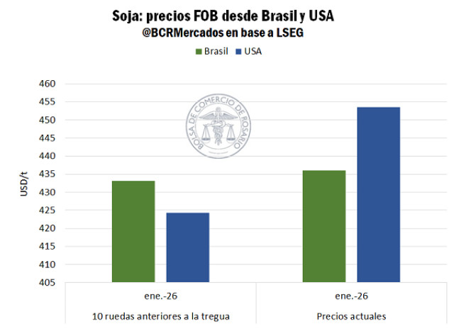 La coyuntura actual vuelve a dejar un mercado internacional partido, un origen barato y otro caro, con la salvedad de que la situación es la inversa a lo que ocurría previo a la tregua. Ahora es Brasil el origen más barato y con diferencia, US$ 20/t menos, un 4% por debajo del Golfo de México. Se da una suerte de mercado comprador cautivo en la medida que importadores chinos se vuelquen a comprar porotos norteamericanos con el objetivo de honrar el volumen prometido, lo que mantiene el nivel actual de cotizaciones. El futuro del nivel de precios dependerá de la conjugación entre dos variables claves, la cantidad de toneladas que compre China, y la ventana de tiempo en la que lo haga. Entre más se acerque a lo prometido luego de la tregua, entonces el mercado tendrá más factores para convalidar un nivel de precios alto, como los US$ 425/t de la semana pasada. En caso contrario, si el mercado descuenta cada vez más improbable que los asiáticos cumplan con el objetivo a corto plazo de las 12 Mt, entonces las cotizaciones tenderían a caer, ya que los porotos norteamericanos deberían de competir contra los brasileros para colocarse en otros destinos, tendiendo a una convergencia en las cotizaciones.
