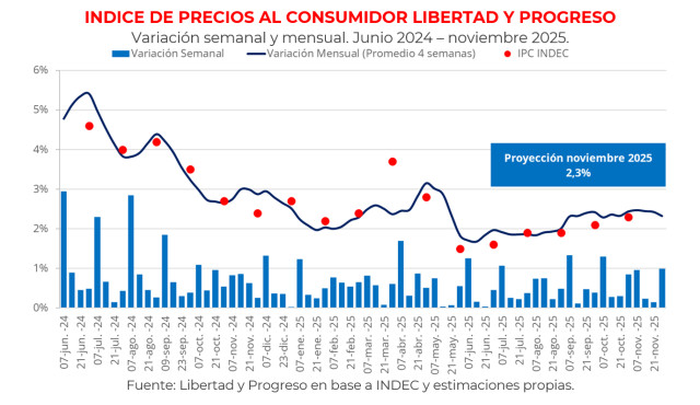 Iván Cachanosky, Economista Jefe de la Fundación Libertad y Progreso, dice que "noviembre mostró un nivel de inflación acorde a lo esperado todavía con los rezagos que se generaron por la incertidumbre electoral. Si bien para diciembre todavía esperamos un nivel de inflación mensual por encima del 2%, creemos que a partir del 2026 se retorna al proceso de desinflación y que incluso para finales de año podría rondar ya por debajo del 1% mensual".