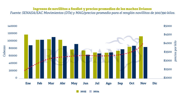 En paralelo, al analizar la estadística de ingresos de animales a corrales de engorde durante noviembre, se observa un incremento significativo respecto al mismo mes del año anterior, con un 35% más de novillitos ingresando a los feedlots, totalizando 112.703 cabezas.