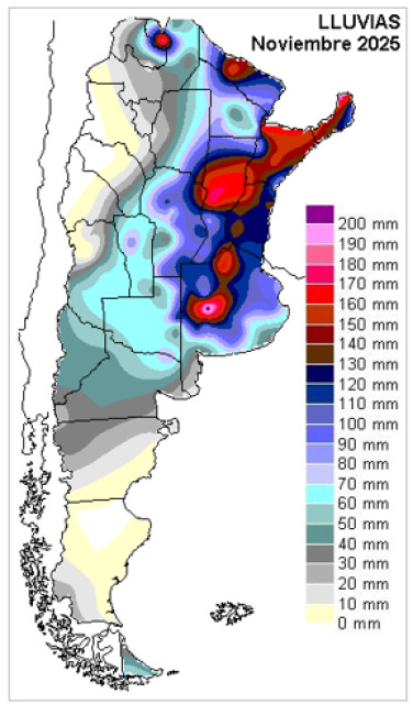 En resumen el mes de noviembre ha sido favorable para gran parte de la zona núcleo el litoral y la Mesopotamia, corrigiendo bien sobre el este de CB y gran parte de la franja este de LP, donde el patrón, ha sido muy irregular, similar a lo que sucedió en el NEA. Queda pendiente una recuperación de lluvias más pareja y voluminosa sobre el NOA, y la zona central del norte del país.