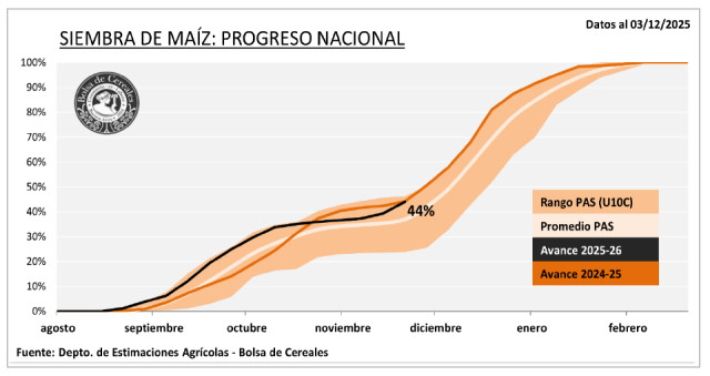 Con un avance de siembra del 44 % y perfiles recargados que aseguran buenas condiciones iniciales, el maíz transita la campaña con un balance hídrico adecuado.