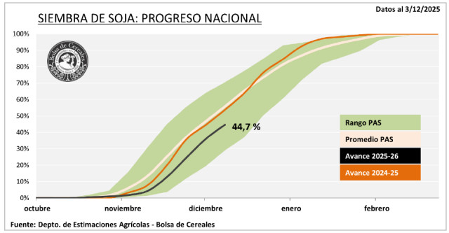 Luego de un progreso intersemanal de 8,7 p.p., la siembra de la oleaginosa registra un avance de 44,7 % a nivel nacional. Comienzan a generalizarse las labores de soja de segunda sobre ambos núcleos.