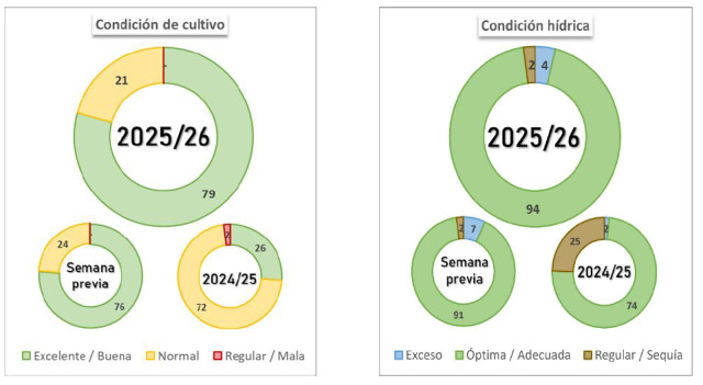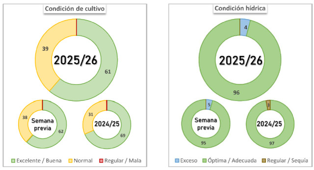 La siembra de maíz con destino a grano continúa avanzando con la apertura de la ventana de siembra tardía en el centro y sur del área agrícola, y ya alcanza el 44 % del total nacional tras un progreso intersemanal de 5 p.p. Del área ya implantada, el 86 % se mantiene en condición Buena a Excelente, impulsado por una adecuada humedad en los perfiles. En línea con ello, la oferta hídrica a nivel nacional muestra un panorama claramente favorable: el 94 % del área se ubica entre condiciones Adecuada/Óptima. Si bien persisten excesos puntuales en el Núcleo Sur, y sectores del centro bonaerense, estos no modifican el escenario general, donde la recarga de los perfiles sostiene una correcta emergencia y un buen desarrollo inicial de los lotes, acompañando el avance de la siembra tardía.