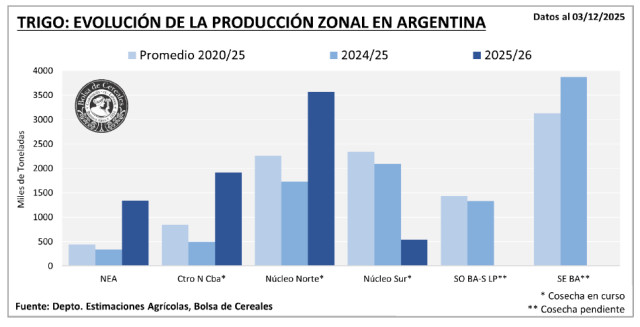 Finalmente, la cosecha 2025/26 de trigo ya cubre el 45,3 % del área apta, tras un progreso intersemanal de 11,4 p.p. La trilla continúa avanzando a ritmo habitual sobre el centro del área agrícola, con rendimientos que se mantienen elevados, entre 35 y 59 qq/Ha en promedio (salvo casos untuales de lotes afectados por granizo). Respecto al área en pie, el 73 % del área ya supera el estadio de madurez, y el 27 % restante que se encuentra en llenado de grano se concentra en el sur del área agrícola donde la oferta hídrica es Adecuada/Óptima en más del 90 % de los lotes. Bajo este contexto, mantenemos nuestra proyección de producción en 25,5 MTn.