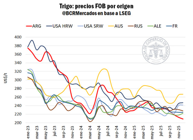 Centrándonos en el plano internacional, las condiciones climáticas en el hemisferio sur se presentan excepcionales. Australia, el mayor proveedor de trigo a esta etapa del año, presenta volúmenes de oferta sorprendentes. De acuerdo con ABARES, una agencia dependiente de su Departamento de Agricultura, las estimaciones de cosecha 2025/26 la posicionan 29% por encima del promedio de los últimos diez años y con perspectivas a ser tercera más grande de su historia.