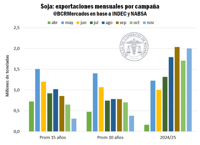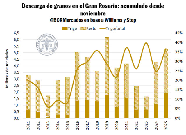 Bajo esta performance nunca vista, con el 47% de avance de cosecha a nivel nacional, las descargas de trigo en puertos del Gran Rosario alcanzaron máximos históricos, acumulando 1,98 Mt en noviembre, el doble que el promedio del último quinquenio y un 80% arriba de la media de la última década. Sin embargo, no solo es trigo lo que entra a los puertos, sino que la soja sumó otros 2,7 Mt, superando el ritmo de ingreso de los últimos diez años.