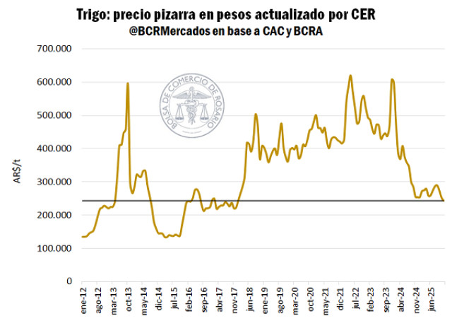 Por el lado de la proteína, los precios de exportación llegan a distanciarse en US$ 10/t comparando un mismo mes de entrega. El FOB de diciembre 2025 para embarcar desde el Up-River se negocia en US$ 195/t para trigo con un nivel de proteína del 10,5% y en US$ 205/t con un nivel de proteína del 11,5%. Inclusive se han llegado a ver ofertas vendedoras para trigo con proteína 12,5% en diciembre por US$ 210/t.