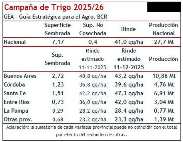 Para la cifra final de producción, además del ajuste de la superficie sembrada y del rendimiento, se tuvo en cuenta un área no cosechada de 400.000 ha. En definitiva, de concretarse la estimación de producción de 27,7 Mt, Argentina produciría en la campaña 2025/26 un 37% más de trigo que en el ciclo previo.