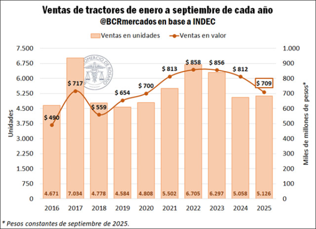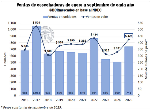 En el caso de los tractores, se advierte que en los primeros nueve meses de 2025 se vendieron 5.126 unidades, apenas 1% por encima de la comercialización de igual período del año anterior, aunque evidenciando un deterioro del 10% respecto al promedio de los últimos cinco años. En términos monetarios, el precio unitario real de esta maquinaria se ubicó por debajo de su valor promedio de los últimos años, de manera que las ventas alcanzaron un importe de $ 708.600 millones, registrando una caída interanual real del 13%, y ubicándose 12% por debajo del promedio.