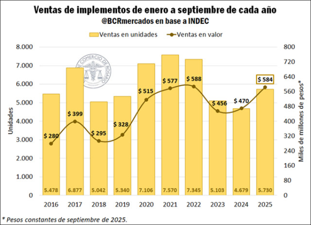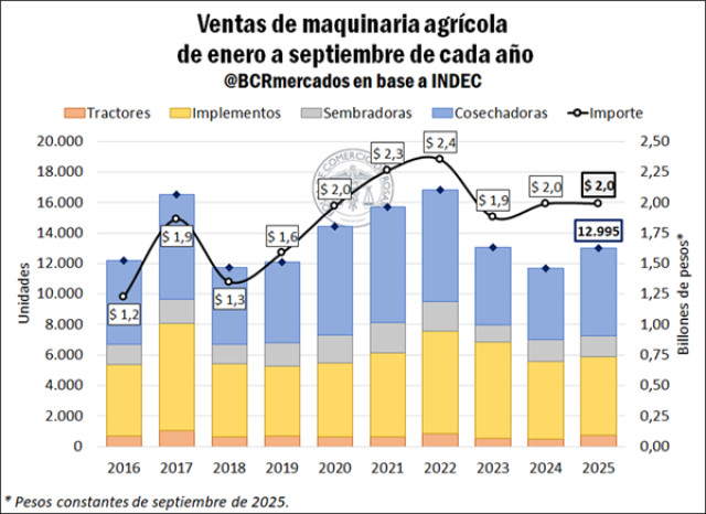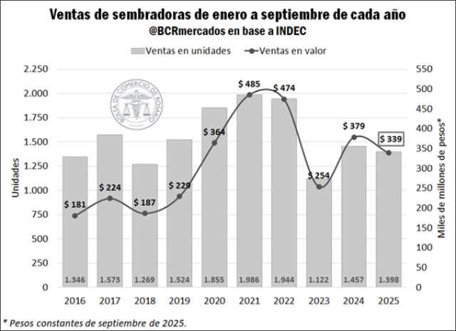 Por su parte, la cantidad vendida de sembradoras totalizó 1.398 unidades, marcando un retroceso interanual del 4% y posicionándose 16% por detrás del promedio del último quinquenio. Los precios de estas maquinarias se abarataron en términos reales en el último año, de manera que el valor de las ventas, que totalizó $ 339.100 millones entre enero y septiembre, registró una caída incluso más pronunciada: se posicionó 10% por debajo de 2024, y 13% por detrás del promedio.