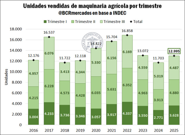 En términos de volumen, las ventas de máquinas agrícolas totalizaron casi 13.000 unidades en los primeros nueve meses del año, marcando un aumento interanual del 11%, aunque cabe aclarar que el período de comparación es el más bajo desde el comienzo de la serie. En la comparación histórica, no obstante, el total de unidades comercializadas marcó un retroceso del 9,5% respecto al promedio del último quinquenio, siendo el segundo volumen más bajo de los últimos seis años.