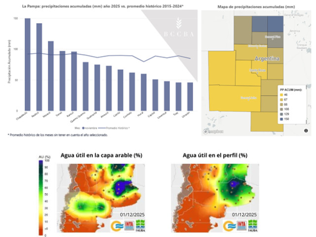Durante noviembre, las precipitaciones fueron inferiores a lo normal en la mayor parte de La Pampa, excepto en los departamentos del norte, donde Chapaleufú y Realicó registraron los mayores acumulados del mes. Este contexto se refleja en una escasa disponibilidad de agua útil tanto en la capa arable como en el perfil.