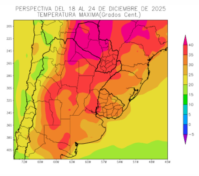 norte de Córdoba, el sudeste del Paraguay, el noroeste y el sudeste de La Pampa y el sudoeste del Uruguay Pampa observarán temperaturas máximas superiores a 35°C, con un amplio foco de registros con valores superiores a 40°C sobre el Paraguay y zonas aledañas y toros focos con valores inferiores.