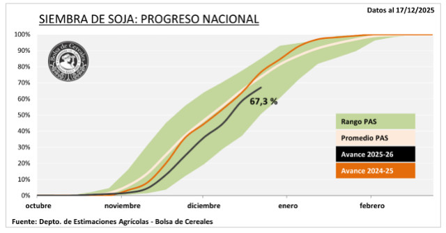 La siembra cubre el 67,3 % a nivel nacional, con un 92,5 % de lo implantado presentando una condición hídrica Adecuada/Óptima. En tanto, el 6,9 % de la soja de primera ha iniciado etapas reproductivas bajo óptimas condiciones de humedad.
