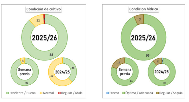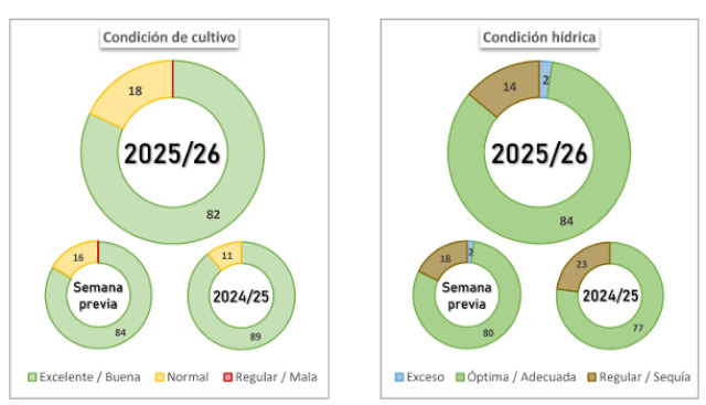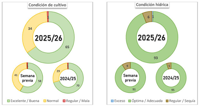 De las 2,7 MHa estimadas, el 48,7 % ya transita desde botón floral en adelante. Tras las lluvias, el 83,3 sostiene condición hídrica Adecuada/Óptima, y el 100 % del cultivo presenta condición Normal/Excelente.