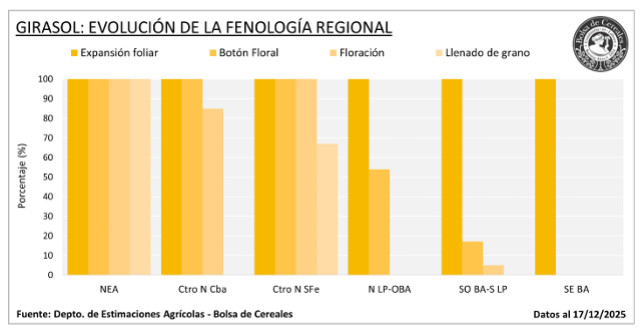 En cuanto al girasol, luego de las precipitaciones registradas fundamentalmente sobre el centro y norte del área agrícola, la condición hídrica se mantiene entre Adecuada y Óptima en el 83,3 % del área. La oleaginosa continúa desarrollando favorablemente e inicia la transición a estadios reproductivos sobre el centro y sur agrícolas, manteniendo una condición entre Normal y Excelente en el 100 % de los casos. En el NEA la recolección de lotes avanza lentamente, pero con rendimientos que continúan superando los 22 qq/Ha. De mediar condiciones climáticas favorables, se espera que el ritmo de recolección se afiance en los próximos días.