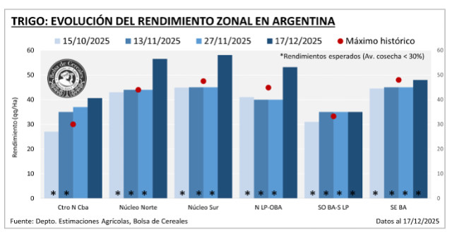 Finalmente, la cosecha de trigo continúa arrojando resultados récord, con rendimientos que se ubican por encima de las estimaciones previas, las cuales ya se encontraban en niveles superiores a los promedios históricos e incluso cercanos o por encima a los máximos registrados. A la fecha, los rindes relevados en las principales zonas cosechadas marcan promedios entre 6 y 11 qq/Ha por encima de los máximos históricos zonales, y hasta 13 qq/Ha superiores a nuestra anterior estimación. Como resultado de este desempeño, actualizamos la proyección de producción nacional a 27,1 MTn, sin descartar nuevas revisiones a medida que avance la recolección en el sudeste del área agrícola, donde aún resta un volumen significativo por trillar.