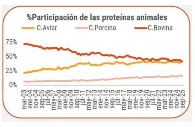 En lo que respecta a la demanda interna, el consumo aparente de proteína animal rondaría los 120 kilogramos per cápita para el año 2025, distribuidos en 52 kilos de carne aviar, 49 de carne bovina y 19 de carne porcina. La participación de la carne bovina cae de forma estructural, mientras la aviar y la porcina ganan espacio debido al factor precio junto con nuevos hábitos del consumidor argentino.