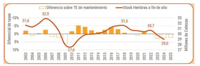 En los últimos años, predominaron tasas de extracción superiores a la de equilibrio. Esta continua liquidación de vientres puede asociarse a necesidades de liquidez y a un contexto financiero poco favorable para la producción, aunque estratégicamente sería necesario retener más hembras para aumentar la oferta.