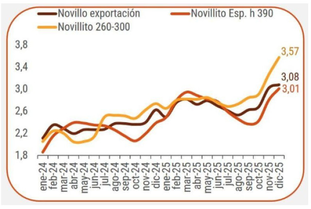 Hacia fines del presente año los precios de los machos muestran niveles muy atractivos: el novillito 260-300 kilos para invernada se ubica en 3,57 u$s/kg, mientras que el novillo pesado de exportación se encuentra en 3,08 u$s/kg y el novillito liviano (hasta 390 kilos) en 3,01 u$s/kg. Estos valores refuerzan la estrategia de sumar kilos al animal, de modo de diluir el costo de una recría cara por una relación compra-venta desfavorable.