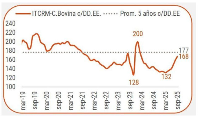 El Índice del Tipo de Cambio Real Multilateral de la carne bovina argentina (ITCRM-Carne) se recuperó de manera importante en los últimos meses, luego de registrar un mínimo de 132 en el primer trimestre de este año.