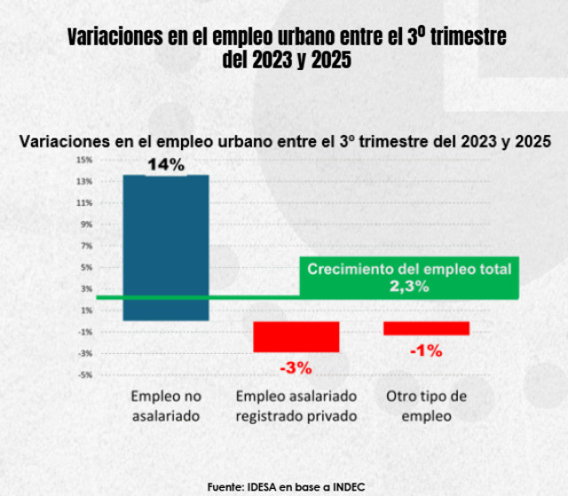 Mientras tanto, el INDEC informó sobre la situación del mercado de trabajo. Comparando el 3º trimestre del 2025 con igual período del 2023, el trimestre anterior al inicio del gobierno de Milei, aparece que el PBI aumentó en 1,3% mientras que el empleo urbano se incrementó en 2,3%. Este aumento en el empleo total se conforma de: