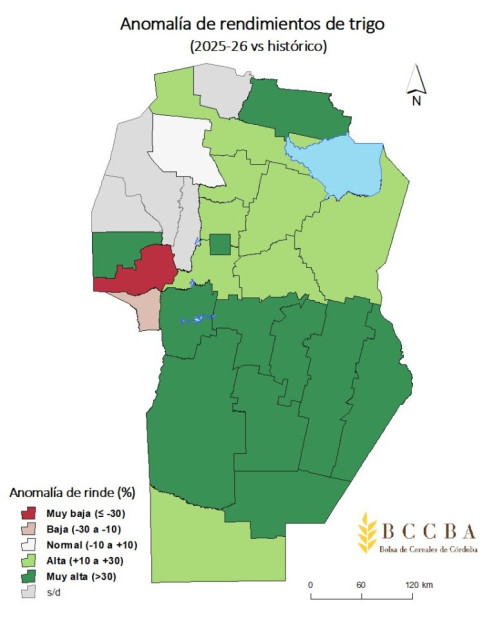 Tras el relevamiento realizado en la primera semana de diciembre, la estimación de producción de trigo asciende a 7,3 MTn, valor que duplicaría al obtenido en la campaña pasada. El rinde promedio esperado en secano se ubica en 43,9 qq/ha, superando en más de un 70% al promedio histórico provincial. Incluso el menor rendimiento estimado, que según los reportes sería de 28,0 qq/ha en el departamento Ischilín, se posiciona por encima del histórico. Por su parte, en los sistemas bajo riego se informaron rendimientos significativamente superiores, con registros de hasta 90 qq/ha en las localidades de Río Cuarto y Arroyito. En este contexto, el mapa de anomalía de rendimientos —definida como la diferencia porcentual entre el rinde estimado y el promedio histórico para cada departamento— muestra que en la mayor parte del territorio provincial los valores son positivos, con predominio de incrementos altos y muy altos.