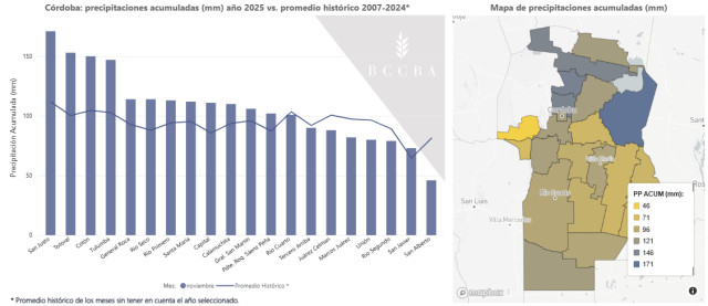 Las lluvias de noviembre fueron heterogéneas en todo el territorio. En San Justo, Totoral, Colón y Tulumba superaron ampliamente los promedios mientras que, en otros departamentos como Marcos Juárez y Unión, no lo alcanzaron.
