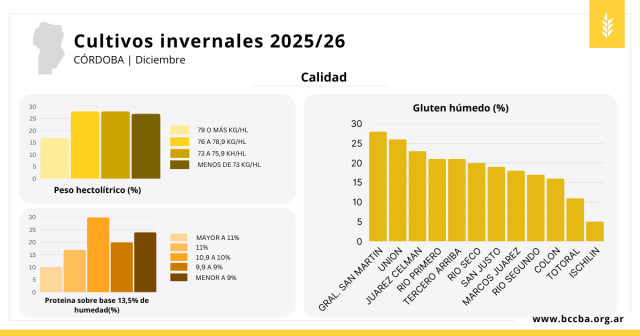Todos los datos de calidad de trigo son de carácter provisorio y provistos por la Red de Colaboradores DIA, los mismos serán actualizados y/o confirmados por el Monitoreo de calidad de trigo que realiza anualmente la Cámara de Cereales de Córdoba en conjunto con el INTA Marcos Juárez. En el siguiente enlace se puede acceder a un informe preliminar: