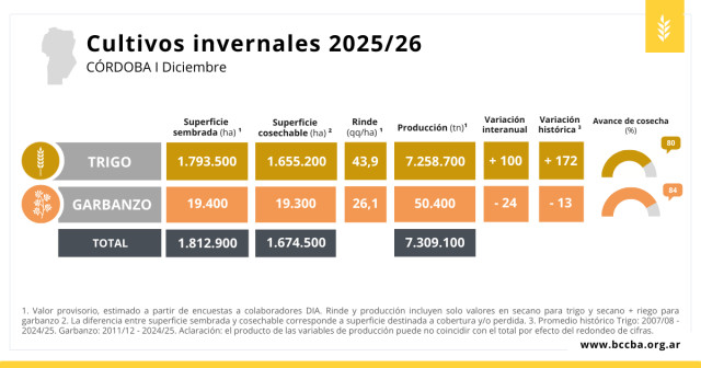 Para garbanzo, se esperan rindes variables entre zonas, condicionados principalmente por excesos hídricos, algunos episodios de granizo y, en menor medida, la incidencia de enfermedades. No obstante, el rinde promedio provincial superaría en más de un 30% al promedio histórico, por lo que se anticipan resultados positivos para los productores garbanceros.