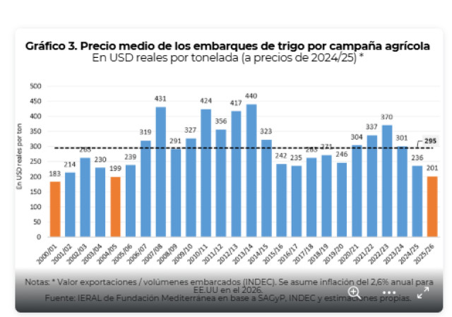 Como se mencionase anteriormente, el motivo de que el hito productivo no tenga su correlato en récord de divisas se encuentra en una floja coyuntura de precios para el cereal. Para tener orden de magnitud, en el gráfico 3 se observa que en 2025/26 el precio medio de las exportaciones de trigo constituiría el tercer peor registro en lo que va del siglo (casi empatado con 2004/05, solo algo mejor que en 2000/01) y guardaría una brecha negativa de más del 30% con respecto a su promedio histórico (USD 201 versus USD 295 por tonelada, respectivamente).