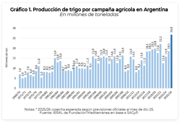 El récord productivo de la campaña de trigo 2025/26 se apoya en condiciones climáticas favorables que permitieron alcanzar rindes excepcionales; pero también en señales de política orientadas a construir una arena de negocios más amigable con el sector privado (menor presión impositiva, avances en la normalización del frente cambiario y una agenda declarada de reducción de costos y trabas administrativas), que contribuyeron a sostener el cultivo dentro de la rotación aun cuando las perspectivas de precios tampoco eran las mejores al inicio de la campaña.