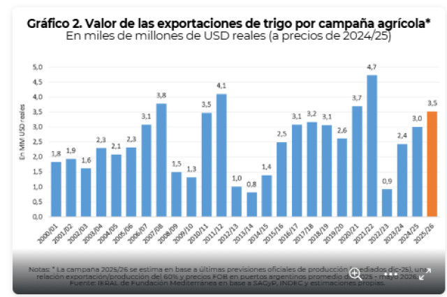 Teniendo en cuenta que alrededor del 65% de la producción se destinaría a la exportación (unos 17,5 millones de toneladas) y utilizando un precio medio en torno a USD 200 por tonelada de trigo para los embarques (promedio en base a FOB puertos argentinos, dic-25 a mayo-26), se estima un ingreso de divisas de USD 3,5 mil millones por las exportaciones de trigo en la campaña 2025/26.