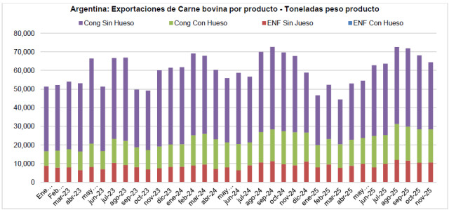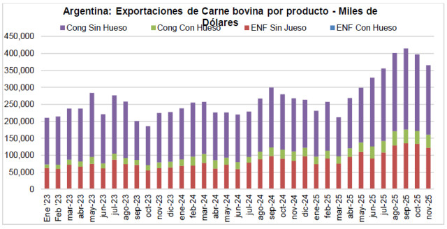 Las exportaciones del mes de noviembre de 2025 alcanzaron un volumen cercano a las 64,5 mil toneladas peso producto de carne bovina refrigerada y congelada; por un valor del orden de los 365,6 millones de dólares. Con respecto al mes de octubre de 2025, los volúmenes embarcados muestran una caída moderada, del (-5,4%); mientras que el valor obtenido muestra un retroceso más marcado, del (-7,9%).